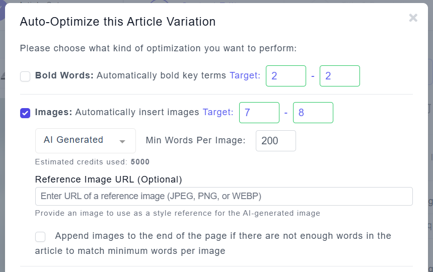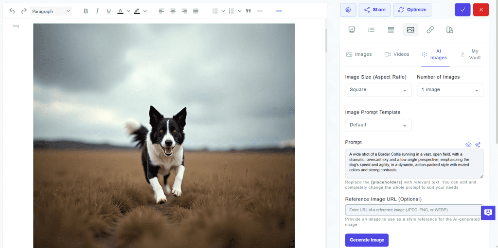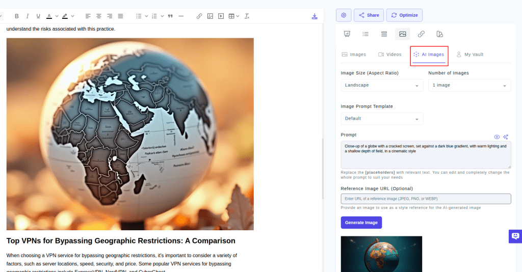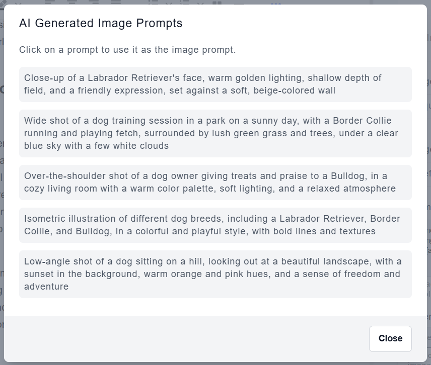 A modal window will appear with five different prompts, automatically generated based on the content of your article. Just click on the one you like, and it will be instantly added to the prompt field.
