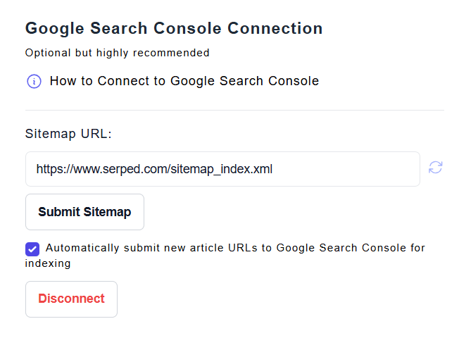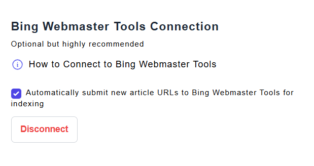 Once connected, you can also choose to automatically submit new article URLs, helping you get indexed faster across supported search engines.