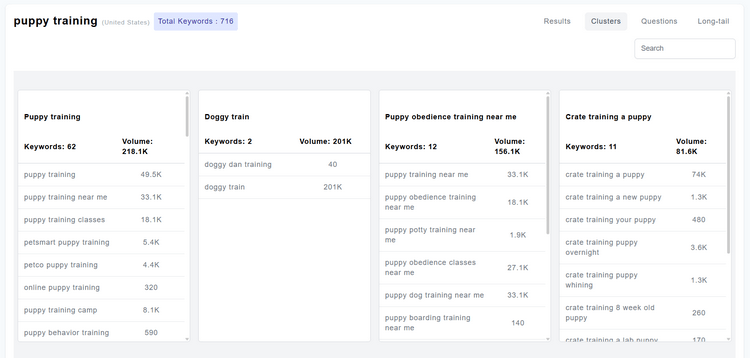 When you click this tab, all keyword suggestions generated by the tool are neatly organized into clusters, making it a huge time-saver if you’re looking to streamline your research or plan content more efficiently.